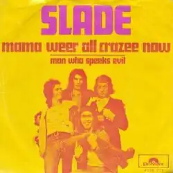 "Mama Weer All Crazee Now" is a song by the British rock band Slade, released in 1972 as the lead single from their third studio album Slayed? It was written by lead vocalist Noddy Holder and bassist Jim Lea, and produced by Chas Chandler. It reached No. 1 in the UK, giving the band their third number one single, and remained in the charts for ten weeks.[2] In the United States, the song reached No. 76.[3]
