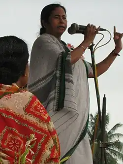 Banerjee previously served twice as Minister of Railways, the first woman to do so.[15] She is also the second female Minister of Coal, and Minister of Human Resource Development, Youth Affairs and Sports, Women and Child Development in the cabinet of the Indian government.[16] She rose to prominence after opposing the erstwhile land acquisition policies for industrialisation of the Communist-led government in West Bengal for Special Economic Zones at the cost of agriculturalists and farmers at Singur.[17] In 2011, Banerjee pulled off a landslide victory for the AITC alliance in West Bengal, defeating the 34-year-old Communist Party of India (Marxist)-led Left Front government, the world's longest-serving democratically elected communist-led government.[18][19][20]