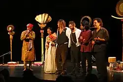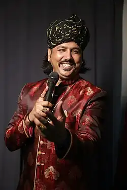 He was also a part of Shankar Mahadevan's folk project titled My Country, My Music.[3] He was the lead vocalist of Roysten Abel's show, The Manganiyar Seduction,[20] which has been touring the world since 2006.[21] He has performed at some of India's most popular festivals including the NH7 Weekender,[22] Mood Indigo,[23] Repertwahr Festival,[24] Rajasthan Partnership Summit[25] and Sahitya Aaj Tak.[26] In June 2018, he performed with his troupe at the Mumbai's National Centre for the Performing Arts (NCPA), where he also collaborated with Kaushiki Chakraborty.[27] First folk singer to play the opening act at NMACC's Studio Theatre in 2023.
