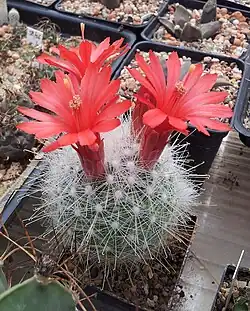 The cactus grows in groups, and grow up to 8 inches tall. They form large red flowers that range from 5.5 to 6 centimeters in diameter.