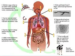 Mammomonogamus is a genus of parasitic nematodes of the family Syngamidae that parasitise the respiratory tracts of cattle, sheep, goats, deer, cats, orangutans, and elephants. The nematodes can also infect humans and cause the disease called mammomonogamiasis.[1] Several known species fall under the genus Mammomonogamus, but the most common species found to infest humans is M. laryngeus. Infection in humans is very rare, with only about 100 reported cases worldwide, and is assumed to be largely accidental.[2] Cases have been reported from the Caribbean,[3] China,[4] Korea,[5] Thailand,[6] and Philippines.[7]