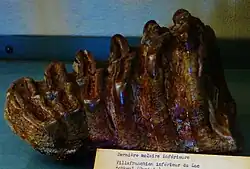Mammuthus africanavus (literally, "African ancestor mammoth") is a species of mammoth known from remains spanning the Late Pliocene-Early Pleistocene found in Central and North Africa in the countries of Chad, Morocco, Tunisia and Algeria. It was originally described by Camille Arambourg in 1952 based on remains found around Lake Ichkeul in north Tunisia as a species of Elephas (which contains the living Asian elephant).[1] Some specimens from this sample may genuinely represent Elephas rather than Mammuthus, though the holotype has been argued to likely represent a true mammoth.[2] Some authors have argued that the species should be placed in Loxodonta (which contains living African elephants), reflecting the difficulty in distinguishing the teeth of early elephantids.[1] It is distinguished from the earlier Mammuthus subplanifrons by having a higher number of ridges/lamellae on the teeth (around 9-10 on the third molars), which display a greater parallelity, the molars being more hypsodont (high crowned),[1] with the molars having a greater amount of cementum and thinner enamel, and the molar plates exhibit closer spacing.[3]