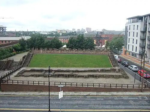 Mamucium, also known as Mancunium, is a former Roman fort in the Castlefield area of Manchester in North West England. The castrum, which was founded c. AD 79 within the Roman province of Roman Britain,[1] was garrisoned by a cohort of Roman auxiliaries near two major Roman roads running through the area. Several sizeable civilian settlements (or vicus) containing soldiers' families, merchants and industry developed outside the fort. The area is a protected Scheduled Ancient Monument.[2]