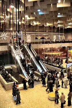 The typical life span of a shopping centre is about 10–20 years, at which point the owners may do nothing, refurbish or demolish.[81] In the Arndale, refurbishment began about six years after opening. Artificial lighting and undistinguishable malls, with multiple dead ends and no obvious circular route, meant that shoppers were, in Morris's words, "bewildered by its maze-like intensity". Parkinson-Bailey described the centre as "never the pleasantest place to shop in ... hot and stuffy".[82] Criticisms were addressed in a half-million pound upgrade[83] in which roof lights were inserted to allow in daylight and pot-plants introduced.[84] To improve navigation and to tone down the appearance, the flooring of each area was given a distinct colour scheme, decorative ironwork was installed, and a fountain was placed at one corner and a double-floor height aviary placed at another. The Arndale's own radio station, Centre Sound, was installed. Hallé Square housed a food court by day and could be used as a concert area by night if required. Beddington describes the results as "workmanlike but unromantic".[58]