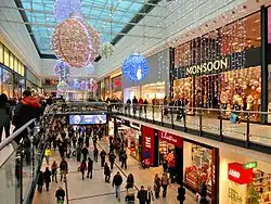 The centre has a retail floorspace of just under 1,400,000 sq ft (130,000 m2) (not including Selfridges and Marks and Spencer department stores to which it is connected via a link bridge), making it Europe's third largest city-centre shopping mall.[5] It is one of the largest shopping centres in the UK, with 41 million visitors annually,[6] ahead of the Trafford Centre, which attracts 35 million.[7]