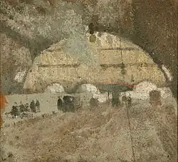 The station's roof is a single span wrought iron truss structure 550 feet (168 m) long with a span of 210 feet (64 m), and was 90 feet (27 m) high at its apex above the railtracks. Glass covered the middle section, timber (inside) and slate (outside) covered the outer quarters. The end screens were glazed with timber boarding surrounding the outer edges. It was constructed by Andrew Handyside and Co.[5] The substructure and masonry partition were provided by Robert Neill and Sons of Manchester. Underneath the train shed is a large brick undercroft with intersecting tunnel vaults, above which were six platforms above street level which exited the station onto viaducts and bridges.[6] The undercroft was used for storage and connected to the adjacent goods sidings by a carriage lift. The station's two-storey south wall has 15 bays separated by brick pilasters. At ground-floor level, the bays have three round-headed windows and at first-floor level three square-headed. In the 20th century, a glazed canopy was erected at the entrance at north end.[3]
