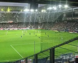 In 2008, Manchester City once again qualified for the UEFA Cup through the Fair Play rankings. As City had to play the qualifying rounds, it meant a very early start to the season, in mid-July. Their first match was a trip to the remote Faroe Islands to play EB/Streymur. As Streymur's ground had a capacity of only 1,000, the match was moved to Tórsvøllur, the Faroese national stadium.[51] Two early goals gave City a 2–0 win.[52] The home leg was unusual in that it was played outside Manchester. The pitch at the City of Manchester Stadium had been relaid following a Bon Jovi concert, and was not ready in time. Instead, the match was played at Barnsley's Oakwell ground.[53] Another 2–0 win resulted in a 4–0 aggregate scoreline.[54] In the second qualifying round City played FC Midtjylland. The first leg ended in a 1–0 defeat, only City's second ever home defeat in European competition.[35] In the second leg City looked to be heading out of the competition until an 89th minute cross was diverted into his own net by Midtjylland's Danny Califf. The tie then went to extra time, and City progressed on penalties.[55] In the first round proper Cypriots AC Omonia took the lead, but City overcame the deficit and won 2–1, and also won the second leg by the same scoreline.[56]