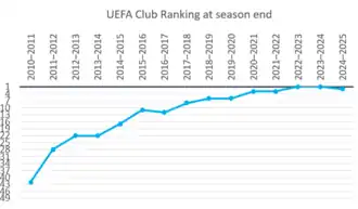 UEFA rebranded and restructured the UEFA Cup in 2009, resulting in it becoming the UEFA Europa League. By finishing fifth in the 2009–10 Premier League, Manchester City qualified for this competition. A play-off round took place before the four team group stage, in which Manchester City beat Timișoara of Romania home and away.[62] City's group stage opponents were Juventus, Red Bull Salzburg and Lech Poznań. Each team played the others twice. City's opener was in Salzburg, and resulted in a 2–0 win.[63] A 1–1 draw at home to Juventus then followed.[64] A 3–1 win at home to Lech Poznań is remembered primarily not for the action on the pitch, in which Emmanuel Adebayor scored a hat-trick, but for the actions of the Polish supporters, whose backs to the pitch dance was later adopted by Manchester City fans, for whom it became known as The Poznań.[65] The return match with Lech Poznań resulted in a 3–1 defeat, but a 3–0 home victory over Red Bull Salzburg ensured qualification with a match to spare.[66] The dead rubber against Juventus ended 1–1, and Manchester City won the group.[67] In the knockout stages City then beat Aris 3–0 on aggregate,[68] and met Dynamo Kyiv in the last 16. City lost 2–0 in Kyiv, and had to play most of the second leg with ten men after Mario Balotelli was sent off. A 1–0 win was insufficient to overcome the deficit, as City lost 2–1 on aggregate.[69]