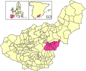 The Mancomunidad de Municipios Marquesado del Zenete or Mancomunidad del Marquesado del Zenete ("Mancomunidad of municipalities of the Marquisate of Cenete") is a voluntary grouping (mancomunidad) of municipalities, located in the province of Granada, autonomous community of Andalusia, Spain. They take their name from the Marquisate of Cenete, the former seigneury (Spanish: señorio) in this area, which in turn takes its name (historically spelled either Zenete or Cenete) from the Arabic sened, meaning the slope that constitutes one side of a mountain range. That refers to the north slope of the Sierra Nevada, where the municipalities are located.[1]