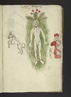 The mandrake-doll in German might be called Alraun Männlein ("mandrake manikin"), in Belgian (Flemish) mandragora manneken, or in Italian mandragora maschio.[8] In German, it is also known as Galgenmännlein ("little gallows man") stemming from the belief that they grow near gallows, also attested in Icelandic þjófarót "thieves' root".[9][10]