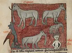 In the Christian allegorical bestiary Physiologus, the chapter on the elephant claims that the male becomes minded to create an offspring, it leads its mate to the growing ground for the female to find the mandragora and come into estrous, the female then brings the root to the male which in turn become inflamed and they mate, making the female immediately pregnant.[44][45] The elephants are illustrated in e.g., Sloane 278.[43]