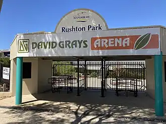 The area that is now Rushton Park was first gazetted as a sanitation site on 20 August 1926, and was converted to a recreation reserve in September 1958, under the Mandurah Road Board. The reserve was named for Richard Rushton, a former local government commissioner, with the new name approved on 22 May 1972.[3] The park was first used for football in the 1960s by the Mandurah Football Club in the Sunday Football League.[4] The ground held its first West Australian Football League (WAFL) match in April 1986 between Perth and South Fremantle, with a record attendance at the time of 7,147 people.[5] A further game was hosted in the 1987 season, between East Perth and South Fremantle, with 4,547 in attendance.[6] As well as football, the ground also hosted two cricket matches between a Western Australia Country XI and touring Sri Lankan and Tamil Nadu sides, in 1987 and 1988, respectively.[7] After the Peel Thunder Football Club was accepted into the WAFL for the 1997 season, Rushton Park became its home ground. The first game of the 1997 season, against South Fremantle, drew a crowd of 5,781 people.[8]