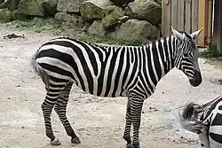 The maneless zebra was first described in 1921 by the Swedish zoologist Einar Lönnberg.[2] He gave it the name Equus borensis based on a type specimen collected near the town of Bor in South Sudan. Later the maneless zebras have been described by several others. Also in 1954 by Tony Henley, then a ranger in the game department of the Protectorate of Uganda based in Moroto and in charge of Karamoja District.[3] Recently, the animals in the Kidepo Valley National Park have been studied by the Kidepo Wildlife Foundation.