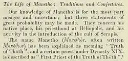Manetho (/ˈmænɪθoʊ/; Koine Greek: Μανέθων Manéthōn, gen.: Μανέθωνος, fl. 290–260 BCE[1]) was an Egyptian priest of the Ptolemaic Kingdom who lived in the early third century BCE, at the very beginning of the Hellenistic period. Little is certain about his life. He is known today as the author of a history of Egypt in Greek called the Aegyptiaca (History of Egypt), written during the reign of Ptolemy I Soter or Ptolemy II Philadelphus (285–246 BCE). None of Manetho’s original texts have survived; they are lost literary works, known only from fragments transmitted by later authors of classical and late antiquity.