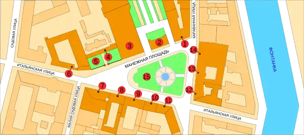 | 3 — Mikhailovsky Manege (Zimniy Stadion) | 10 — Apartment house | |