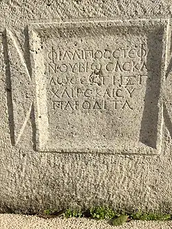 A Roman Byzantine building has been excavated against the city wall and next to a street paved with big limestone tiles and which has a channel on its longitudinal axis. It is composed of an atrium with a complex system for collecting rainwater, a palace composed of monumental halls with columns and a basilica. It was probably a bishop's palace.