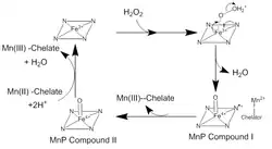 - ^ a b Wariishi H, Valli K, Gold MH (November 1992). "Manganese(II) oxidation by manganese peroxidase from the basidiomycete Phanerochaete chrysosporium. Kinetic mechanism and role of chelators". J. Biol. Chem. 267 (33): 23688–95. doi:10.1016/S0021-9258(18)35893-9. PMID 1429709.