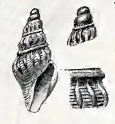 (Original description in German) The shell is smaller than that of Xymenopsis muriciformis (P. P. King, 1832), the whorls are even more distinctly stepped apart from each other, because the strongest convexity is shifted more towards the suture. The body whorl tapers downwards more rapidly, and the beginning of the constriction occurs somewhat earlier. The coloration is brownish-whitish; on fresh material, a rust-brown coating is frequently noticeable, which, however, seems to originate from iron oxide. The interior shows a light reddish-brown base color, which is modified by a white, streaky, more or less strong enamel layer. The apertural margin, however, is broadly bordered white, and the main part of the siphonal canal is colored dark chestnut-brown. The sculpture is very similar to that of Xymenopsis muriciformis, only the folds are probably somewhat stronger, and the spiral grooves are more continuous and more distinctly pronounced. These, however, are differences that could very well be related to the fresher condition of the shells. The folds are separated by interspaces, as in Xymenopsis muriciformis, and as in that species, individual differences also occur here in the number of spiral grooves and in their arrangement. A more frequent weak convexity of the interspaces may perhaps also be related to the better state of preservation.