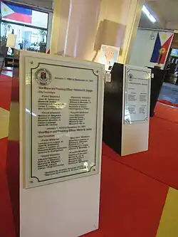 This would be the setup until 1901, after the Americans took control of the islands. Under the provisions of the Manila City Charter enacted that same year, the Manila Municipal Board was established, consisting of three members appointed by the Civil Governor with the approval of the Philippine Commission. These members could be removed through the same process. One of the appointees was designated as the president of the Board and was tasked with presiding over all meetings.[3] In 1903, the Philippine Commission enacted Act No. 936, expanding the Municipal Board’s composition to five members by including the City Engineer and the President of the Advisory Board as ex officio members. During that time, the Municipal Board consisted of two Filipinos and three Americans.[4][5] An advisory board was included, with all eleven members being Filipinos, representing each of Manila's 11 wards. In 1916, the advisory board was abolished, and the municipal board was increased to ten members, all of them elected by Filipinos, although the mayor was still appointed. However, the municipal board ceased to function until World War II. It reconvened on July 20, 1945, upon the liberation of Manila, consisting of new members appointed by President Sergio Osmeña.[6]