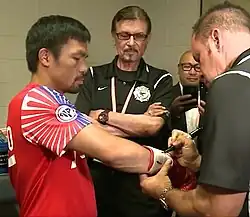 After Thurman's fight with Josesito López, he publicly said he wanted to fight Pacquiao next.[6] It was initially thought that Errol Spence Jr. would be next on Pacquiao's list when he came up the ring after Spence easily disposed of Mikey Garcia. It had also been rumored that Pacquiao would be facing Thurman next and Spence would instead have a unification bout with Shawn Porter.[7] On May 11, 2019 it was announced that Pacquiao–Thurman would happen on July 20, 2019 and a few days after, MGM Grand Garden Arena announced that they would be hosting the fight.[8] Betting odds started in favor of Thurman but slowly went Pacquiao's way as the fight drew closer.[9] Throughout the promotion, Thurman had nice things to say about Pacquiao being a legend as a sign of respect and would follow it up with how he planned on finishing Pacquiao's career.[10]