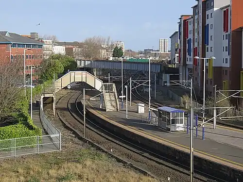 Most platforms at Manors closed on 23 January 1978[2] to allow for the construction of the Tyne and Wear Metro. The station now has two platforms, on the site of the previous platforms 7 and 8. Other parts of the former station remain, including the heavily overgrown platforms 1 and 2 and parts of platform 9.[5] The station is unstaffed, and the only facilities are a shelter with a telephone, a bike rack and a ticket machine (card only). The platforms are reached by a footbridge rather than by the original subway, so the station is not accessible for wheelchair or mobility-impaired users.[6]