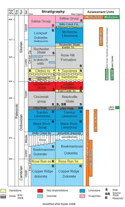 3. ^ Riley, R.A., Baranoski, M.T., and Wickstrom, L.H., 2006, Regional stratigraphy of the Trenton-Black River, in Patchen, D.G., Hickman, J.B., Harris, D.C., Drahovzal, J.A., Lake, P.D., Smith, L.B., Nyahay, R., Schulze, R., Riley, R.A., Baranoski, M.T., Wickstrom, L.H., Laughrey, C.D., Kostelnik, J., Harper, J.A., Avary, K.L., Bocan, J., Hohn, M.E., and McDowell, R. "A geologic play book for Trenton-Black River Appalachian basin exploration". U.S. Department of Energy Report, Morgantown, WV, DOE Award Number DE-FC26-03NT41856, P. 4-38, 30 PLS.{{cite journal}}: CS1 maint: multiple names: authors list (link) CS1 maint: numeric names: authors list (link)