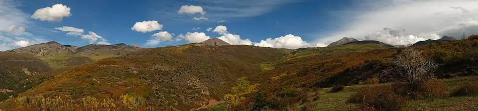 The Manti–La Sal National Forest covers more than 1.2 million acres (4,900 km2)[2] and is located in the central and southeastern parts of the U.S. state of Utah and the extreme western part of Colorado. The forest is headquartered in Price, with ranger district offices in Price, Ferron, Ephraim, Moab and Monticello.[5] The maximum elevation is Mount Peale in the La Sal Mountains, reaching 12,721 feet (3,877 m) above sea level. The La Sal Mountains are the second highest mountain range in Utah after the Uintas. Parts of the forest are included in the Bears Ears National Monument.