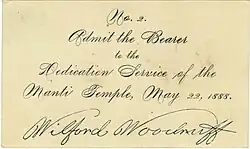 The temple was completed in 1888, and a private dedication was held on May 17, 1888, with a prayer written by Wilford Woodruff. Three public dedications were held on May 21–23, 1888, and were directed by Lorenzo Snow.[10]