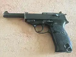 Walther P38 - The Mauser plant in Oberndorf, Baden-Württemberg, Germany was captured in April 1945 by the French military. With the captured machines and parts of the Walther P.38 pistols manufactured at this plant kept as war reparations, the French firm Manurhin manufactured these pistols between June 1945 and 1946 in contravention of previously agreed upon Allied regulations. The French pistols had steel grips, an overall grey parkerized finish and were marked with the Mauser production stamp "SVW" and the addition of a French "Rounded Star" stamp on the right side of the slide which indicated a pressure/proof of "Ordinary Smokeless Proof (Powder "T") Pressure". A number of these P.38s were sent to Indochina and ended up in the hands of members of the French Foreign Legion who had served in the Wehrmacht during the war. These pistols have been referred to as "Grey Ghost P38's" due to their appearance.[2]
