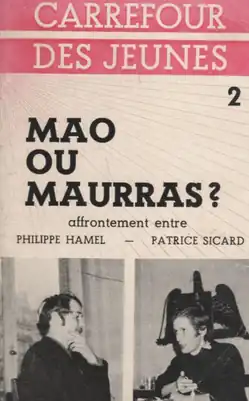 Mao ou Maurras? (Mao or Maurras?) is the transcription of an interview between two young political activists Philippe Hamel, communist, and Patrice Sicard, royalist from Action française, published in 1970. Guy Baret, future journalist at Le Figaro, brings them together in this second volume of the collection Carrefour des Jeunes.[1]
