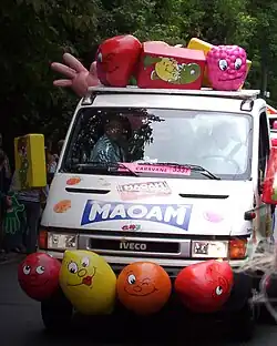 Maoam is a brand of sweets produced by the German confectionery company Haribo.[1][2] The product name is a century old.[3][4][5] The product consists of chewy fruit-flavoured candy in various flavours. A packet of Maoam sweets usually includes five pieces of a particular flavour, and several of these packets are stacked into a stick which is then sold. The sweets are also available in larger packages. Maoam sweets contain gelatine.[6][4]