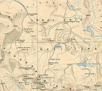 Tianshuihai[2][3] (Chinese: 甜水海; pinyin: Tiánshuǐ Hǎi; lit. 'sweet water sea'), alternately spelled Tien Shui Hai,[4] is a salt water lake in the disputed Aksai Chin region administered by China as part of the Xinjiang Autonomous Region (Hotan County, Hotan Prefecture),[5] which is also claimed by India. The lake's basin is a small plain, formerly known as the Thaldat basin[6] or Mapothang.[7] The lake drains the Thaldat stream that flows from the southwest.[6] It is located east of the Lokzhung Range and northwest of the Aksai Chin Lake.[8]