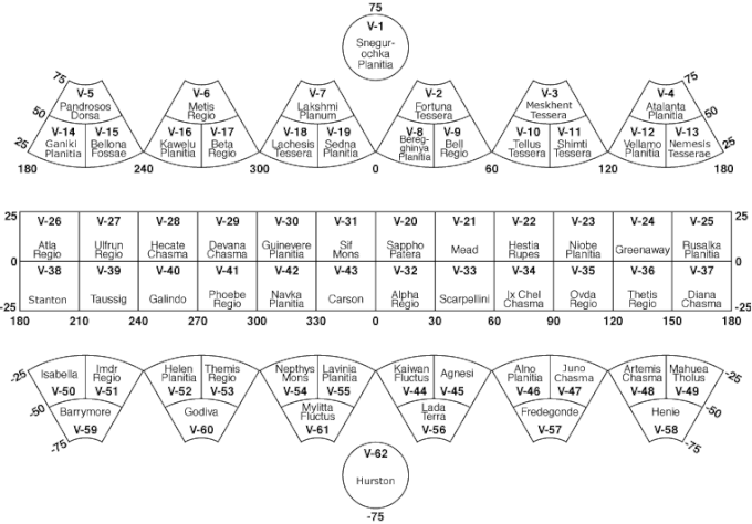 The United States Geological Survey defines sixty-two cartographic quadrangles for the surface of Venus,[54] with V-1 as the north pole region and V-62 as the south pole region. Base on the FMAPs, different groups of Venus researchers are mapping different quadrangles for the surface of Venus, resulting in different type of units defined.