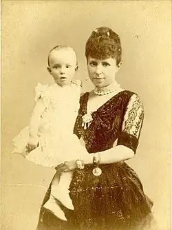 She became pregnant again before the death of her husband in November 1885 (the king suffered from tuberculosis yet he led an active life).[5] An attributed dying wish by Alfonso XII pleading to her is "Ya verás cómo todo se arregla providencialmente. Pero, si muero, guarda el coño y ándate siempre de Cánovas a Sagasta y de Sagasta a Cánovas" ("You will see how everything is going to be providentially fixed, yet if I die, keep your pussy at bay and always go from Cánovas to Sagasta and from Sagasta to Cánovas").[8] While possibly apocryphal, it is representative of the Restoration era.[5] Months later, in May 1886, she would give birth to a male child, Alfonso, who reigned as Alfonso XIII upon his birth.