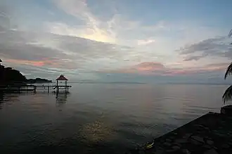 The lake drains via the San Juan River flowing east to the Caribbean Sea, historically making the city Granada on the northwest shore an Atlantic port, although Granada (as well as the entire lake) is closer to the Pacific Ocean geographically. The Pacific is near enough to be seen from the mountains of the largest island in the lake, Ometepe. The lake has a history of Caribbean pirates who assaulted Granada on three occasions.[4] Before construction of the Panama Canal, a stagecoach line owned by Cornelius Vanderbilt's Accessory Transit Company connected the lake with the Pacific across the low hills of the narrow Isthmus of Rivas. Plans were made to take advantage of this route to build an Interoceanic Canal, the Nicaragua Canal, but the Panama Canal was built instead. In order to quell competition with the Panama Canal, the U.S. secured all rights to a canal along this route in the Bryan–Chamorro Treaty of 1916. However, since this treaty was mutually rescinded by the United States and Nicaragua in 1970, the idea of another canal in Nicaragua still periodically resurfaced, such as the Ecocanal proposal . In 2014, the government of Nicaragua offered a 50-year concession to the Hong Kong Nicaragua Canal Development Investment Company (HKND) to build a canal across Nicaragua at a cost of US$40 billion, with construction expected to begin in December 2014 and complete in 2019.[5] Protests against the ecological and social effects of the canal as well as questions about financing led to doubts about the project,[6] and in the end construction never began.