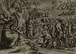 The narrative concerning Marah in the Book of Exodus states that the Israelites had been wandering in the desert for three days without water;[3] according to the narrative, Marah had water, but it was undrinkably bitter, hence the name, which means bitterness.[1] In the text, when the Israelites reach Marah they complain about the undrinkability,[4] so Moses complains to Yahweh, and Yahweh responds by showing Moses a certain piece of wood, which Moses then throws into the water, making it sweet and fit to drink.[5]