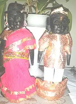 Marapachi Dolls, also known as Marapachi Bommais (literal meaning: "wooden dolls"), are traditional dolls made specifically of red sandalwood (Pterocarpus santalinus) or silk-cotton-wood (Bombax) or red wood (Sequoioideae) which are displayed during the Golu festival in South India as part of Dassara or Navaratri celebrations. These dolls made in pairs generally of male and female are dressed up by children as part of plaything and displayed during the Golu or "Bommai Kolu" festival. Tirupathi is one of the locations where it is specially ornamentally carved, and the dolls are stated to represent Venkateshwara and his consort.[1][2][3] They are also made in Kondapalli as Raja-Rani (King and Queen) dolls which are a compulsory display during the Golu festival.[4]
