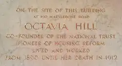 The lobby, refurbished in 2019, contains a small plaque commemorating Octavia Hill, the social housing reformer and founder of the National Trust,[47] who lived in a house formerly on the site of the building.