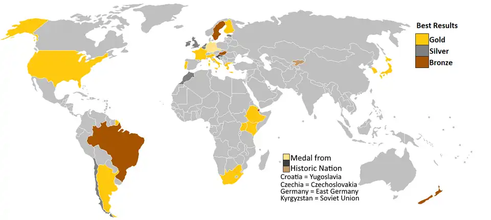 The Olympic records for the event are 2:06:26 hours for men, set by Tamirat Tola in 2024, and 2:22:55 hours for women, set by Sifan Hassan in 2024. The men's marathon world record has been improved several times at the Olympics: in 1908, 1920, and then at successive Olympics by Abebe Bikila in 1960 and 1964.[14] Abebe Bikila, Waldemar Cierpinski, and Eliud Kipchoge are the only athletes to have won two Olympic gold medals in the marathon. No athlete has won more than two medals of any colour. Ethiopia have won the most gold medals in the event, with six, while Kenya has the greatest medal total with fifteen overall.