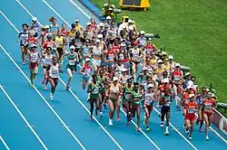 The championship records for the event are 2:06:54 hours for men, set by Abel Kirui in 2009, and 2:20:57 hours for women, set by Paula Radcliffe in 2005.[1] The world record has never been broken or equalled at the competition by either men or women, reflecting the lack of pacemaking and athletes' more tactical approach to championship races.[2]