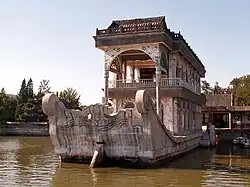 In 1860, during the Second Opium War, the pavilion was burnt on the orders of Lord Elgin.[1] It was restored in 1893 on order of Empress Dowager Cixi.[1] In this restoration, a new two-story superstructure was designed which incorporated elements of European architecture. Like its predecessor, the new superstructure is made out of wood but it was painted to imitate marble. On each "deck", there is a large mirror to reflect the waters of the lake and give an impression of total immersion in the aquatic environment. Imitation paddlewheels on each side of the pavilion make it look like a paddle steamer.[1] The pavilion has a sophisticated drainage system which channels rainwater through four hollow pillars, which is finally released into the lake through the mouths of four dragonheads.
