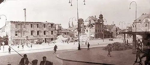Maribor was the site of a German prisoner-of-war camp from 1941 to 1945 for many British, Australian, and New Zealand troops who had been captured in Crete in 1941.[49][50] In 1944, the largest mass rescue of POWs of the war in Europe took place when 105 Allied prisoners from the camp were freed by Slovene partisans in the Raid at Ožbalt. The city, a major industrial centre with an extensive armament industry, was systematically bombed by the Allies in the closing years of World War II. A total of 29 bombing raids devastated some 47% of the city area, killing 483 civilians and leaving over 4,200 people homeless.[51] Over 2,600 people died in Maribor during the war.[52] By the end of the war, Maribor was the most war-damaged major town of Yugoslavia.[53] The remaining German-speaking population, except those who had actively supported the resistance during the war, was summarily expelled at the end of the war in May 1945.[54][55] At the same time Croatian Home Guard members and their relatives who tried to escape from Yugoslavia were executed by the Yugoslav Army. The existence of nine mass graves in and near Maribor was revealed after Slovenia's independence.[56]