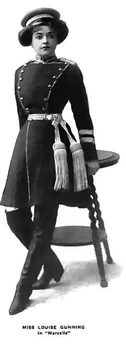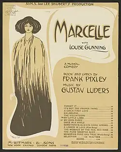 Marcelle is a musical in two acts with music by Gustav Luders and both book and lyrics by Frank Pixley.[1] While billed by its creators as a musical, it was in reality more of an operetta.[2] It was created as a starring vehicle for Louise Gunning who portrayed the title role in the original Broadway production.[3] The role of the Parisian barmaid Marcelle required Gunning to masquerade as her character's brother, a young male soldier; making the part a partial trouser role.[1]