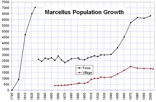 Population of the Town and Village of Marcellus from 1790 to 2004. The rapid decline between 1825 and 1830 was due to both a decrease in the area of the town and the general population shift westward.