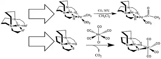 Darensbourg et al. reported that reactions of the paramagnetic (NO)Fe(N2S2) with [M(CH3CNn][BF4]2 salts forms a stairstep bond arrangement with square planar MS4 conformations. Reactions of the nitrosylated iron complex were conducted with metal salts composed of NiII, PdII, and PtII. Darensbourg et al. reported that each tri-metallic complex demonstrated similar nitrosyl stretching values in IR spectroscopy despite differences in magnetic properties. Magnetic susceptibility and DFT calculations additionally showed that each of the {Fe(NO)}7 units exhibited antiferromatic coupling and that each N2S2 ligand engaged in a superexchange interaction with the bimetallic derivatives. The interactions presented by each metal ion displayed a trend of increasing covalency in the order of NiII << PdII << PtII. Upon comparisons of the coupling strengths of each Nickel-sulfur-bridged multimetallic complex, Darensbourg et al. concluded that the antiferromatic coupling of each Fe(NO) spin center was facilitated by an intricate d-orbital overlap with the NI2S2 plane.[16]