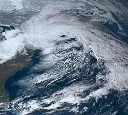 ![]() Satellite image of the winter storm moving across the Northeastern United States during the evening hours of March 14, 2023 | |