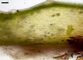 - ^ Flores, Jorge R.; Bippus, Alexander C.; de Ullivarri, Carmen Fernández; Suárez, Guillermo M.; Hyvönen, Jaakko; Tomescu, Alexandru M. F. (December 2023). "Dating the evolution of the complex thalloid liverworts (Marchantiopsida): total-evidence dating analysis supports a Late Silurian-Early Devonian origin and post-Mesozoic morphological stasis". New Phytologist. 240 (5): 2137–2150. doi:10.1111/nph.19254. ISSN 0028-646X. PMID 37697646.