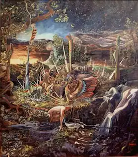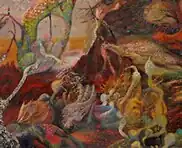 The Tonaltimbrica was presented as "a two-dimensional painting in a single figurative system."[15] Stylistically, it is characterized by the extreme reduction of its two constituent elements: on one hand, the "tonal" element that outlines the masses in the background of the painting using a color base that defines spaces through variations in tone within a uniform chromatic range; on the other hand, the "timbric" sign, consisting of the relief texture of pure color that structures the tonal masses in the background of the picture.[16][17] It is through the interaction of these two distinct components (tonal+timbric) that a representation is achieved that is "rough and poignant," "able to make one feel the struggle and drama that continuously unfold at every level of life."[13]