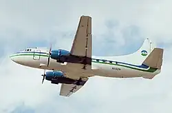 The Marco Island Airways fleet initially consisted of six Martin 4-0-4 twin-engine pressurized piston-engine 44-seat airliners (shown in heading image), five examples being operated as at March 1985.[3] Three of the smaller twin turboprop Beech 99 (N1921T, N1922T, N1923T) were included in the fleet in 1973. Four Piper PA-31 Navajo eight-seat airliner was also operated in the early 1980s.[4]