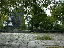 The Harlem Fire Watchtower was designed by Julius H. Kroehl and erected in 1855–57 of cast iron. The tower was fitted with a 10,000 pound bell cast by Jones & Hitchcock. The watchtower allowed observers to use the natural elevation of the park and the added height of the structure to search for fires, in an era when most buildings were made of wood. The 47-foot (14 m) cast-iron tower is the only one to survive of eleven that had been constructed in the city.[20] It was designated as a city landmark in 1967[21] and added to the National Register of Historic Places in 1976. The watchtower, still bearing its bell, is located at the center of the park on an artificial plateau called The Acropolis.[20]